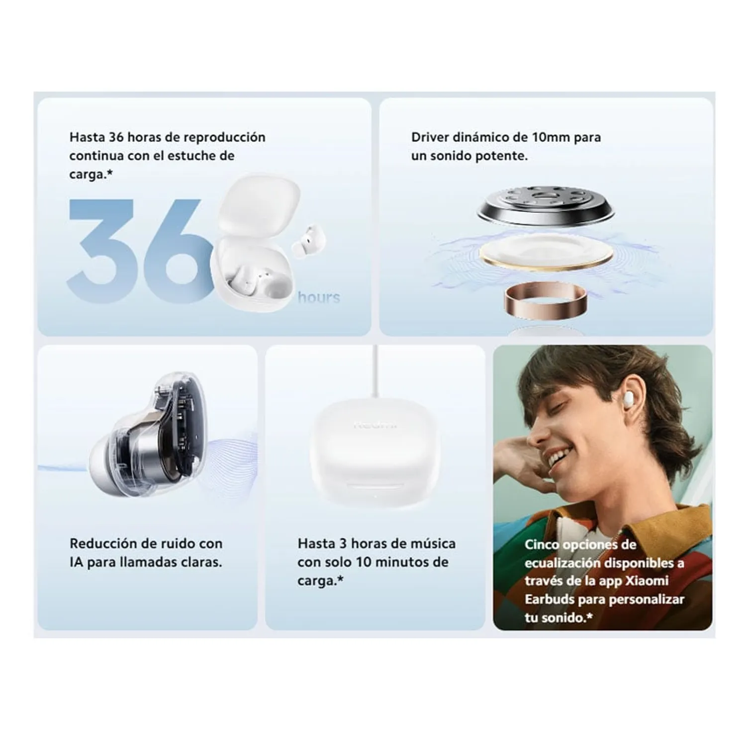Todo ello contando con un excelente sonido. Incorpora un controlador dinámico de gran tamaño de 10 mm, ajustado con precisión por Xiaomi Acoustic Lab para otorgarte una excelente experiencia de audio. Además, estos nuevos auriculares de Xiaomi cuentan con cinco modos de ecualizador preestablecidos para adaptar el sonido a cada tipo de música. Es ajustable a tu gusto y se utilizan igual que los Redmi Buds 6 Active.