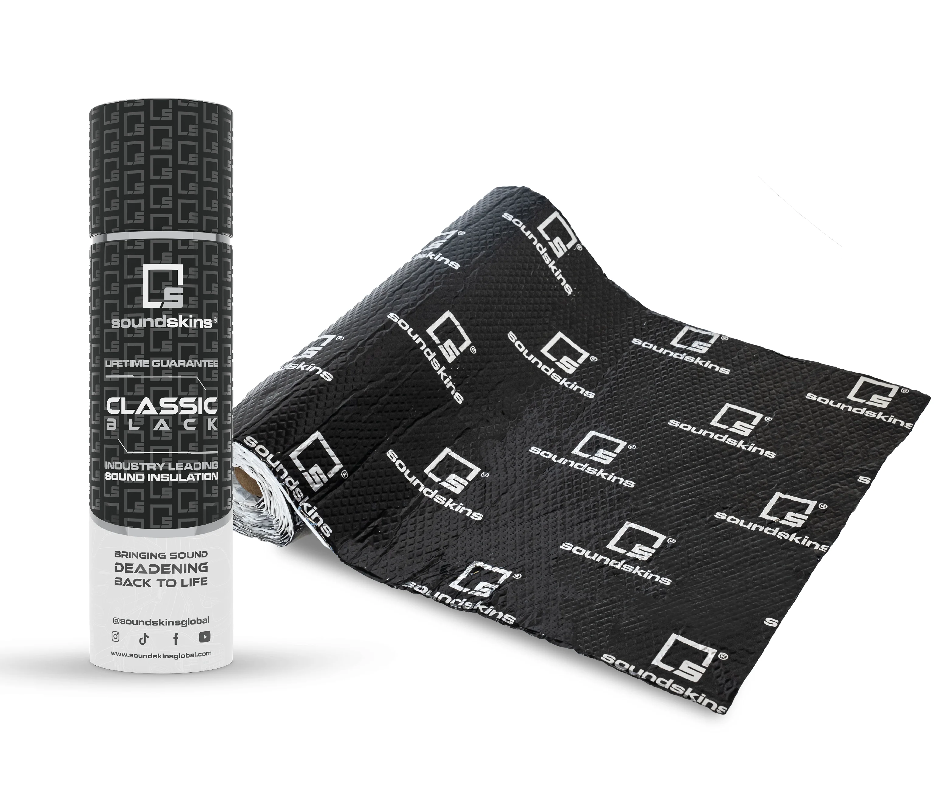 El kit a granel SoundSkins Classic Black mantiene el verdadero estilo SoundSkins® con sus grandes hojas negras de un solo rollo, envuelta muy bien alrededor de un tubo interior para desenrollarla fácilmente.